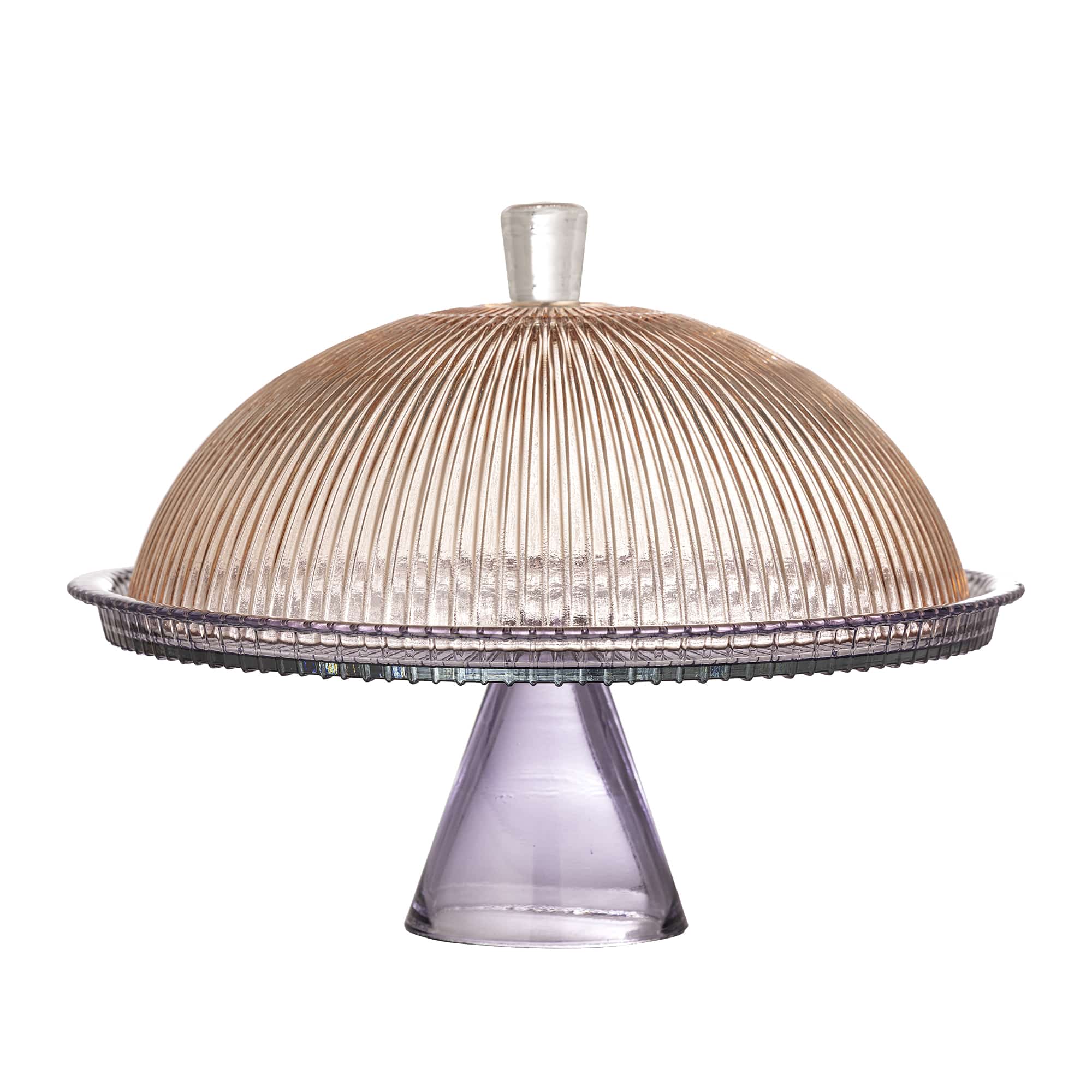 Tayo Kagefadet m/låg fra Bloomingville er i sprayfarvet glas med fine lodrette rifler, der giver dybde og spil. Den høje, koniske fod og det kuppelformede låg fremstår i bløde, afstemte nuancer, som tilsammen giver et raffineret udtryk. Et praktisk og dek